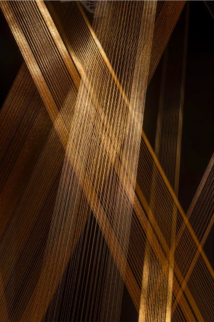 C’est comme une pluie d’or qui relie ciel et terre. A chacun de nos mouvements, au gré des lumières, elle varie ; dans la semi-obscurité, ses lignes bougent, vibrent, disparaissent dans l’ombre, s’imposent avec éclat. Composée de fils de cuivre qui traversent l’espace en diagonales, cette installation magistrale clôt le parcours de trois salles consacré à Lygia Pape.
